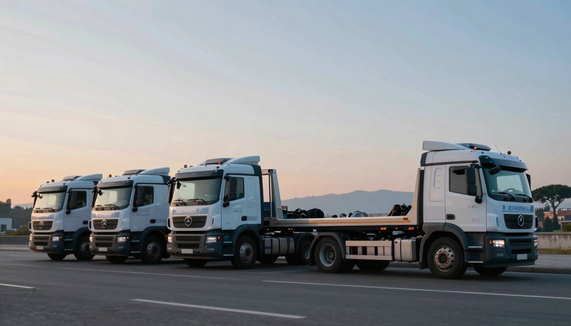 A tow truck moving efficiently through a Roman boulevard. The image captures motion and promptness, utilizing professional cool tones and brand colors.